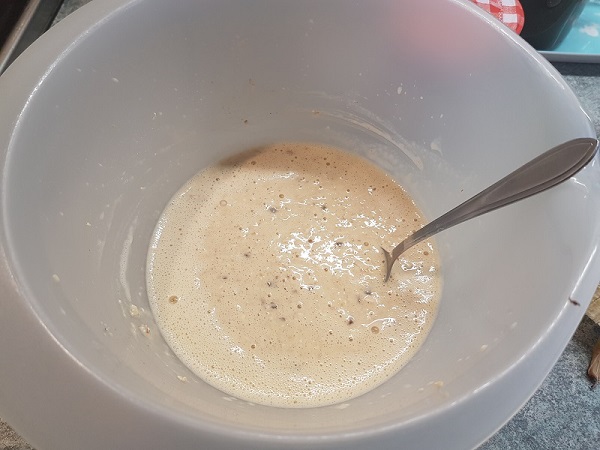 1. これをボールに入れ、ぐるぐる混ぜます。混ぜたら10分ほど放置してオートミールの粉をふやかします。