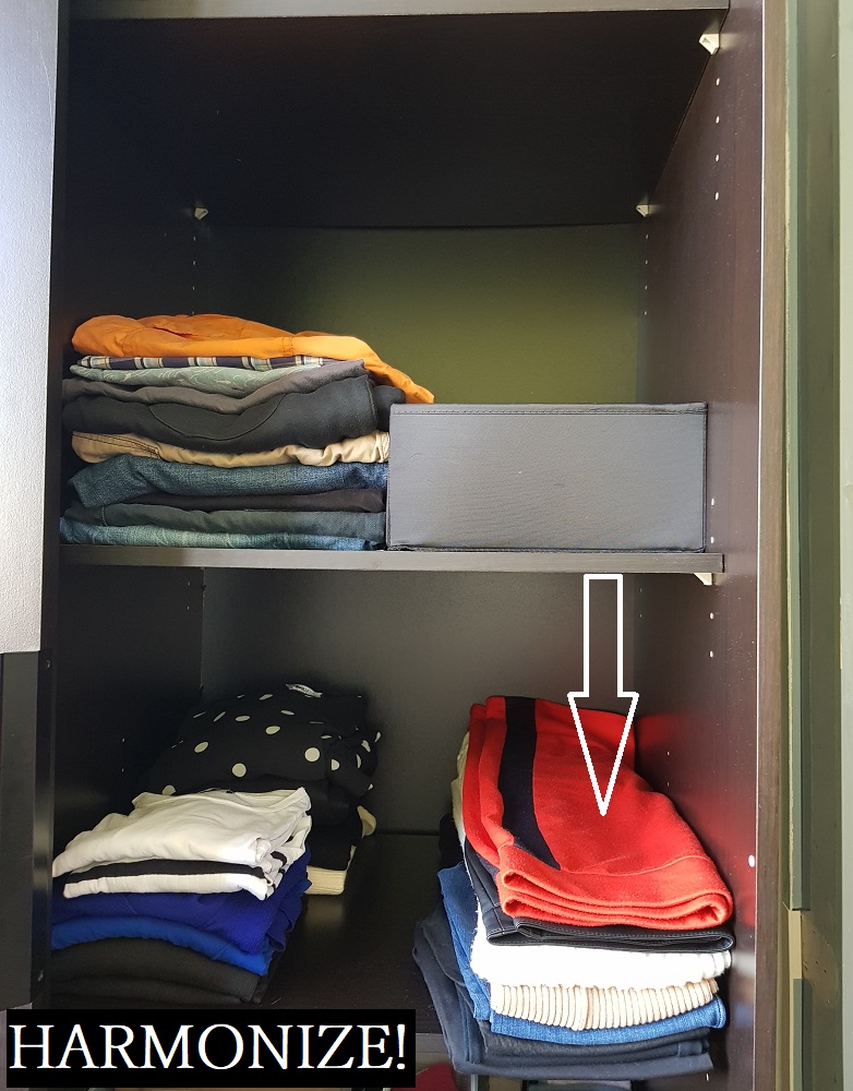 ↓ De rechterkant van de kast heeft planken. Ik maak stapels van opgevouwen kleding en dozen om te ordenen.
