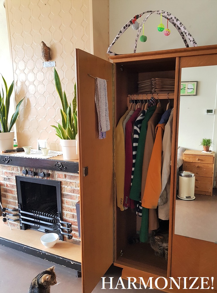 Onze kledingkast is maar 120 cm breed, dus hang ik onze lange winterjassen ergens anders. Ik hang ze in het linkerdeel van de antieke linnenkast in de woonkamer.